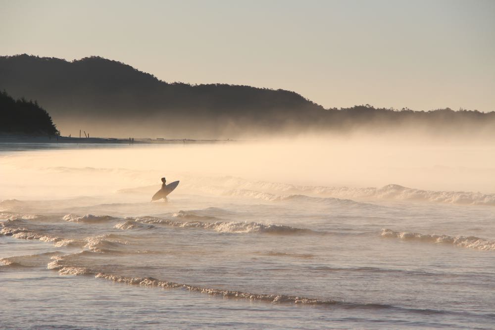 The sound of the surf, which in the days before had been a soothing rhythmic background noise, waves lapping against the shore, had risen several decibels. The whoosh of the waves seemed more aggressive, and as I looked out to the orange-hued beach at sunrise, I could see the whitewash churning to shore under the morning mist.